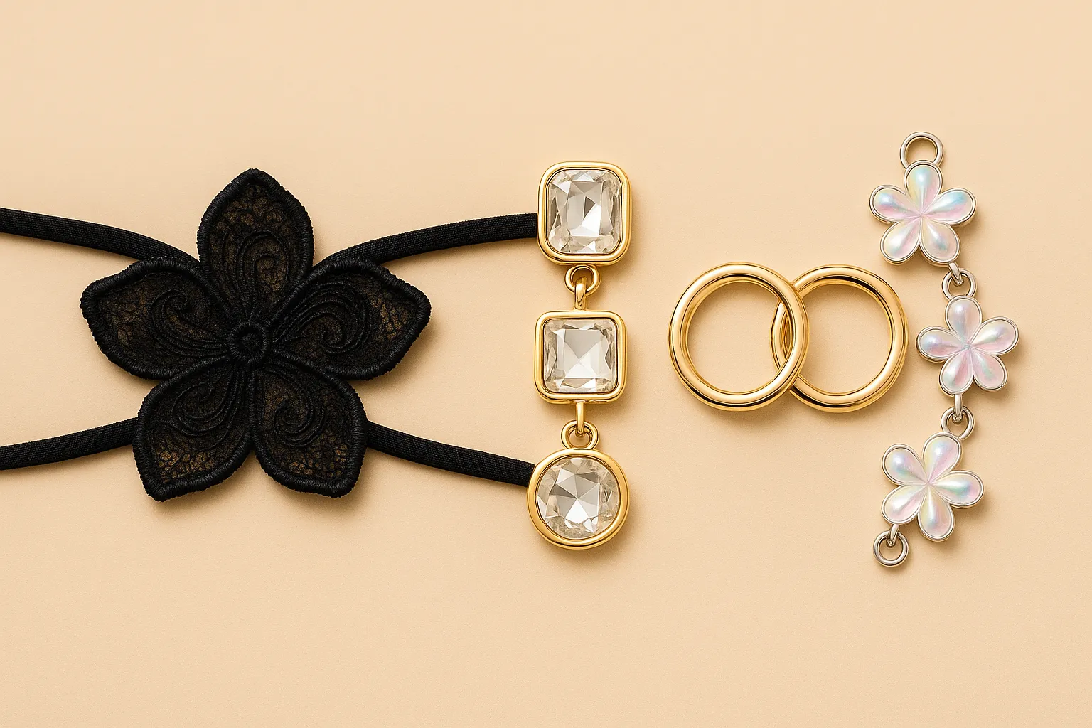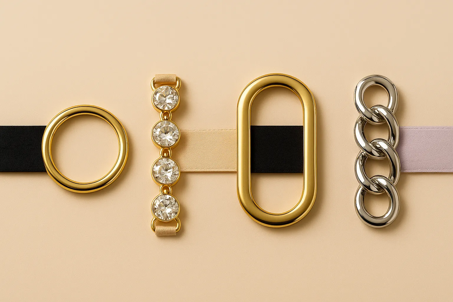 Comunemente utilizzati in corrispondenza di scollature, fianchi e spalline, gli anelli metallici sono un elemento distintivo dei costumi da bagno moderni. Sono disponibili in diverse finiture – oro, argento, nero opaco – e in materiali come lega di zinco o acciaio inossidabile. Offrono sia una funzione strutturale che un valore estetico.